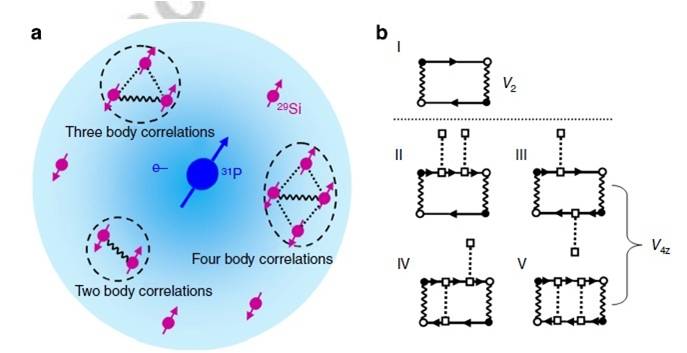 (a) 利用P杂质电子自旋退相干来探测29Si核自旋之间的多体关联;(b) 核自旋的二阶关联和四阶关联的费曼图。