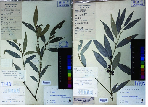 长柄耳扇花Sarcococca longipetiolata M.Cheng的模式标本(A. 主模式Holotype;B. 副模式Paratype)
