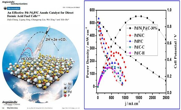 该团队通过向普通的碳黑中掺杂磷化镍(Ni2P)获得了一种简单廉价的复合载体,然后将钯负载在该复合载体上得到直接甲酸燃料电池用阳极电催化剂。该类催化剂在酸性环境中的活性、寿命、抗中毒能力及长效工作稳定性方面均优于商业催化剂和其它已经报道的催化剂。其中,利用该体系中的Pd-Ni2P/C作为DFAFC催化剂时其功率密度高达550mW/cm2,较商业性能提高2.5倍,是目前所见文献报道的DFAFC的最高性能。相关研究成果发表于Angew. Chem. Int. Ed, 2014, 53, 122-126. 被选作"hot paper" 和 "frontispiece"。目前,相关催化剂的批量生产正在进行中。