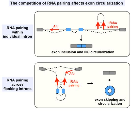 在此项工作中,科研人员利用特殊核酸酶(RNase R)对环形RNA富集,采用全新的计算分析流程,在人源胚胎干细胞H9中发现近万条环形RNA。通过计算分析与实验手段相结合,首次证明了内含子RNA互补序列介导的外显子环化(环形RNA形成)。该研究还发现,不同区域间互补序列的竞争性配对,可以选择性的产生线形RNA或是环形RNA,即内含子内部形成的互补序列配对会促进线形RNA的产生,而跨内含子间的互补序列配对则更有利于环形RNA的产生。值得一提的是,这种互补序列的竞争性配对在不同物种间呈现差异的组合模式,使得外显子来源环形RNA的表达具有物种特异性。更为重要的是,在人类基因组内含子区域中蕴含着大量的互补序列(如Alu等序列),这些互补序列的选择配对及其动态调控使得同一个基因可以产生多个环形RNA,这种现象被称为可变环化(alternative circularization)。这一系列的发现,揭示了环形RNA这一类新型非编码RNA体内的广泛存在,进一步以全新的理论视角揭示了基因表达在转录/转录后水平的复杂性和多样性,为深入研究外显子环化、可变环化、以及剪接的调控机制奠定了坚实的理论基础。