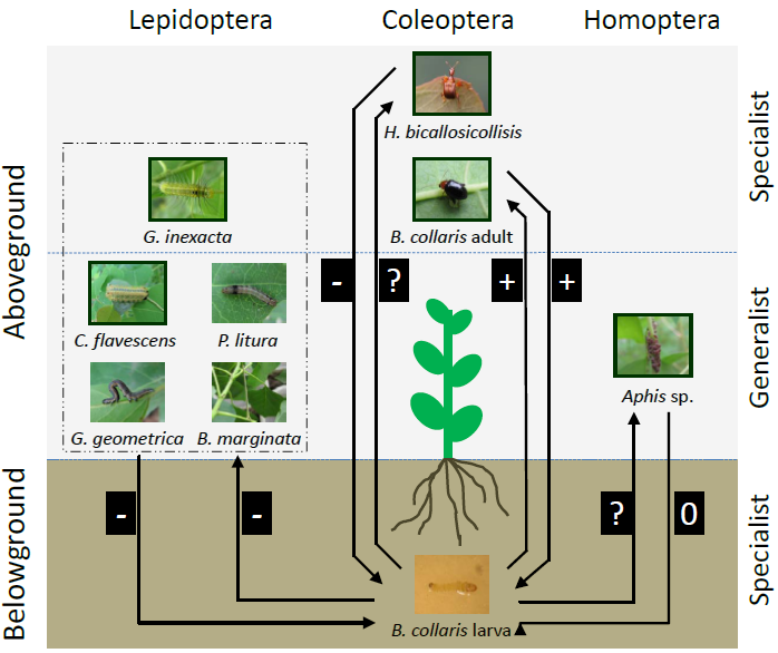 这项研究表明,在具有多种类型地上地下昆虫的群落中,同种昆虫地上和地下之间的相互促进作用对于维持昆虫种群具有重要意义,而异种昆虫地上和地下之间的相互抑制则又限制了这些昆虫(同时具有地上和地下生活史)种群的扩张。因此,这种种内促进和种间抑制关系维持了地上地下群落的稳定和物种的多样性。该研究结果对农业地下有害昆虫的治理以及入侵植物的生物防治也具有重要的指导意义。