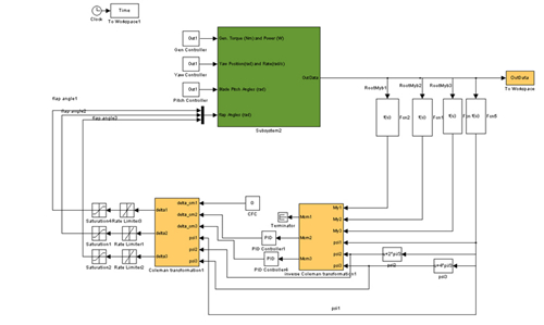 日前,中国科学院工程热物理研究所科研人员率先以Upwind/NREL5MW为参考风力机,通过集成和修改FAST/Aerodyn气动、结构模块,在Matlab/Simulink环境中搭建PID控制器,自主开发了基于柔性尾缘襟翼的“智能叶片”整机气动伺服弹性仿真平台(见图2),并在其基础上讨论了基于该平台下IEC多种湍流风况下的降载效果。结果表明,该智能叶片控制系统能够有效地降低疲劳载荷。