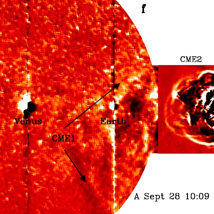 图一:STEREO宽视场成像仪观测到的爆发间隔长达60多个小时的两个日冕物质抛射事件,揭示它们将于地球附近相互作用,并撞击地球。