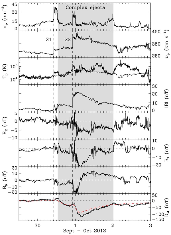 2012年9月30日美国国家海洋大气局(National Oceanic and Atmospheric Administration, NOAA)空间天气预报中心预报了一个G1(较小)的地磁暴,但稍后修改为G3(强烈)水平,该地磁暴被认为是由单个太阳爆发事件所导致。但是,中国科学院国家空间科学中心空间天气学国家重点实验室研究员刘颍等人结合STEREO卫星的宽视场成像观测和太阳风就地测量,证明该地磁暴实际上是一个两步地磁暴,由分开长达60多个小时的两次太阳爆发事件产生(见图一)。