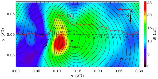 图三:利用太阳风观测数据的重构结果,揭示两个CME合并形成类似磁流绳结构的新型复合抛射体和内嵌的激波面。