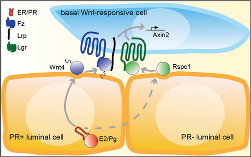 激素影响乳腺器官的发育、体内的乳腺干细胞数量及乳腺癌的发生和发展。以前的研究证实乳腺干细胞不表达激素受体,因此提示系统性的激素信号需要通过局域性的生长因子(微环境信号)介质从而对乳腺干细胞发生作用。曾艺研究员前期的研究揭示Wnt家族是直接影响乳腺干细胞自我更新的微环境信号 (Zeng and Nusse, Cell Stem Cell, 2010),为利用微环境因子在体外扩增干细胞积累了丰富的经验。然而在体内是哪些Wnt相关的分子促进干细胞增殖,其是否介导激素对干细胞的作用仍是悬而未决的问题。