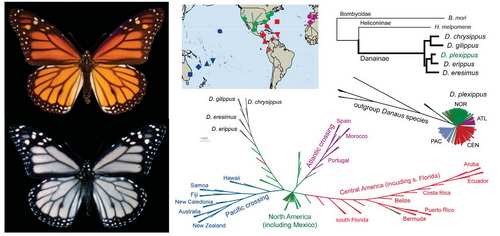 研究人员从涵盖当今世界上主要的帝王蝶分布区域中,选取了包括迁飞型和非迁飞型的22个地理种群、5个近缘种的101只Danaus属蝴蝶进行了全基因组重测序和群体遗传学分析。该项研究表明现存的帝王蝶起源于北美地区,且祖先属于迁飞型,打破了先前认为包括鸟类等在内的迁飞物种均是热带起源,只在种群扩散到温带地区后才进化出迁飞行为的普遍认知。其次,帝王蝶被认为具有多套独特的代谢调节通路,如导航、生物节律、化学感应等来完成长距离迁飞这一复杂的生命现象。但研究人员利用群体遗传学分析对全基因组进行精细扫描发现,仅有包括与肌肉形成相关的collagen IV家族基因在内的基因组区域展现了非常显著的选择信号,而其他的功能通路和相关基因并没有表现出特殊的自然选择痕迹。从而表明,与飞行相关的肌肉发育进化是帝王蝶实现长距离迁飞的主要适应性选择。此外,该项研究还关注了帝王蝶鲜艳体色的维持机制,通过全基因组关联分析,一个与小鼠体色相关的myosin家族同源基因被鉴定出来,从而将无脊椎动物与脊椎动物的体色调节机制联系在一起。