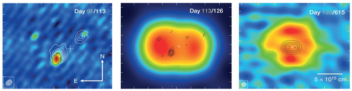 图1:伽马射线新星V959 Mon的射电观测图像。左:伽玛射线爆发后第91天(等值线轮廓图)和113天(伪彩色图像)的EVN观测到的高亮致密射电团块;中:第126天后美国VLA观测获得伪彩色图像(等值线轮廓图为第113天EVN观测结果);右:第615天的VLA观测热辐射结构(伪彩色图像)和第126天的VLA观测热辐射结构(等值线轮廓图)。