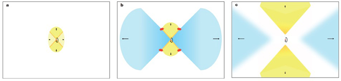 纵观新星V959 Mon的射电结构演化和高能伽马射线的产生机制,该团队认为双星绕转是主要驱动力,其演化可简单分为三个阶段,见图2。(a)白矮星吸积伴星物质并剧烈向外部抛射物质(见黄色区域),其中靠近双星绕转轨道平面的物质获得额外的双星轨道动能,从而抛射速度较快,并且密度较高;(b)同时白矮星向外吹出高速的星风 (见蓝色区域),星风沿着密度较低,基本垂直于双星公转轨道面的方向吹出,使此方向上的热辐射迅速变得光学薄。同时,高速星风和速度较低的抛射物质之间相互作用,产生相互作用面或激波(见红色区域),粒子在激波面上被有效地加速,产生非热的射电辐射和高能伽马射线;(c)星风停止吹出,物质逐渐冷却,热辐射也变得暗淡下来,而沿轨道运动的抛射物质逐渐变得相对明亮起来。