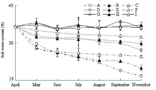 图1 不同密度和水位处理下土壤含水量的变化