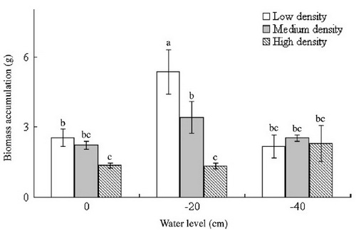 近日,以谢永宏研究员领衔的中国科学院亚热带农业生态研究所湿地生态研究团队以洞庭湖典型湿地植物辣寥为研究对象,研究了不同地下水位和密度条件下辣寥生态生理特征的差异性。结果表明:土壤水分含水量随水位下降而下降,但高密度条件下下降较少(图1)。在0cm和-20cm水位条件下,辣寥生物量随密度增加而逐渐下降,但在-40cm水位下,密度对辣寥生长无明显抑制作用(图2)。进一步研究发现,-40cm水位时,高密度有助于降低植物叶片的受损程度,具体表现为叶片质膜透性和丙二醛含量随密度增加而逐渐降低。可见,增加植物密度可通过维持土壤含水量而有助于植物抵抗干旱胁迫。该结果有助于正确认识密度对种群动态的调控作用,同时可为湿地植被恢复提供一定理论依据。