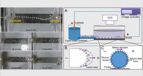 通过系统的对比实验,研究小组探明了液态金属从喷射到液滴产生与运动的三个关键流动相态。在喷射伊始,外界电压产生的电场力会打破液态金属界面的力学平衡,并使其沿电场方向发生变形和运动;当液态金属从毛细管喷射出来进入氢氧化钠水溶液时,由于自身的低粘、高表面张力与电场力相互作用,液态金属射流随即发生Plateau–Rayleigh不稳定现象,由此撕裂离散成粒径均一的液滴;金属液滴在电场作用下易于形成电双层,液滴自身的高导电性会使其界面切向电场力消失,而电双层内的切向电场力必须通过金属液滴运动产生的剪切应力来实现力学平衡,由此诱导了液滴运动方向与电场方向保持一致。在上述过程中,外界电场力是促成液态金属液滴喷射和运动的主要动力来源,而氢氧化钠溶液则有效及时地消除了界面电化学反应生成的金属氧化物。值得指出的是,传统的胶体或金属颗粒电泳现象需要上千伏电压驱动,而此次发现的金属液滴快速运动只需数伏电压即可,其本质原因正在于液态金属优良的导电性和流动性使然。此前,电压诱导的液态金属喷射现象从未被报道过,这种微滴生成与运动效应无需复杂设备,能耗极低,操控极为简便快捷,十分有利于应用。