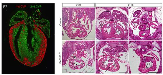 第一和第二冠脉血管群(左),BAF200基因敲除小鼠造成心脏发育异常(右)。