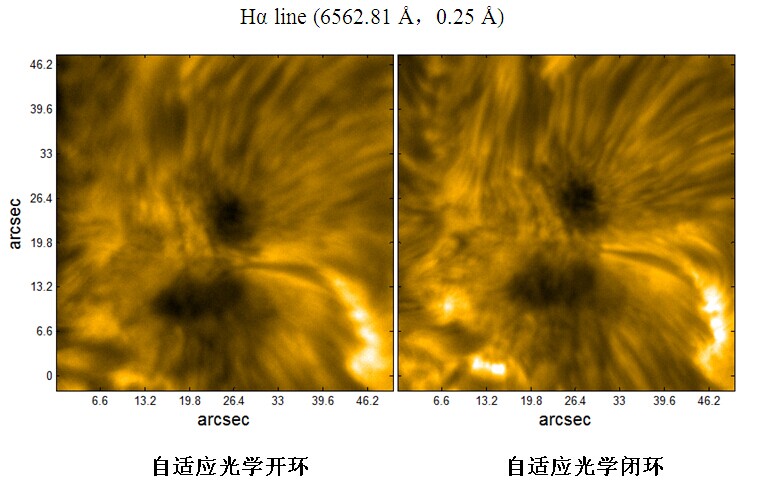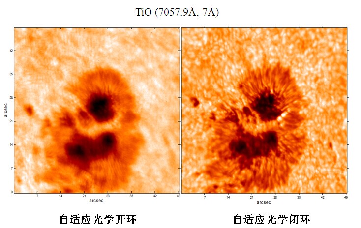 在国家高技术计划和国家自然科学基金天文联合基金重点项目的支持下,中国科学院光电技术研究所太阳高分辨力成像研究课题组成功研制了127单元高阶太阳自适应光学试验系统。近日,在中科院云南天文台的协助下,自适应光学试验系统与1米新真空太阳望远镜成功对接,课题组开展了一系列太阳观测实验,实现了对太阳扩展目标的高阶自适应光学校正,于国内首次同时获取了太阳黑子的高分辨力光球和色球自适应光学校正图像。图1展示了活动区NOAA2135的光球层和色球层图像,第一行是TiO波段(7057.9Å,带宽7Å)观测的太阳黑子光球层图像,第二行是Hα波段(6562.81Å,带宽0.25Å)观测的太阳黑子色球层图像,从左到右分别是自适应光学开环、自适应光学闭环图像。自适应光学闭环工作后,图像质量有了显著提高。