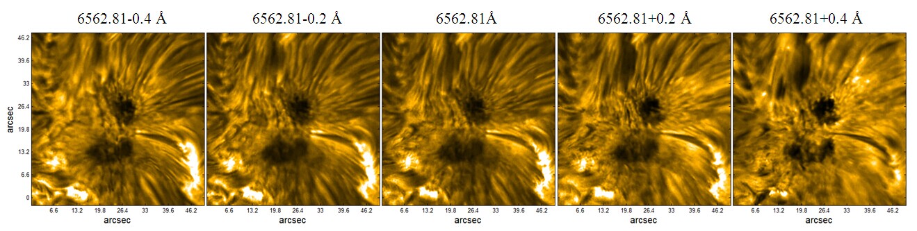 同时,课题组在Hα波段中心波长附近,实现了对太阳黑子从蓝翼到红翼的高分辨力扫描成像。图2展示了对活动区NOAA2135的扫描成像结果,从左到右的成像波长为6562.81-0.4Å,6562.81-0.2Å,6562.81Å,6562.81+0.2Å,6562.81+0.4Å。