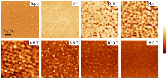 磁力显微镜(MFM)因其能在纳米尺度对磁结构进行实空间成像而获得了广泛的应用,但目前低温磁场下的磁力显微镜较少,一方面由于商业整套设备价格昂贵,另一方面在于低温强磁场下磁力显微镜的设计需满足结构紧凑、温漂小、刚性强等要求,因此,自主设计和加工难度较大。依托强磁场中心二号超导磁体,陆轻铀课题组利用该蜘蛛马达制成了一套可在液氦温度和强磁场下工作的MFM,并测量了Pr0.55(Ca0.75 Sr0.25) 0.45MnO3 薄膜样品在150K加磁场后的MFM图像,结果表明,该系统可在15.0T的磁场中工作(最新测量场强达到17.6T)。该项设计成果已发表在Ultramicroscopy 上(147 (2014) 133–136)。