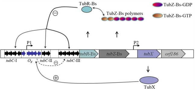 球型芽胞杆菌由于能够产生高毒力的杀蚊二元毒素蛋白而被广泛应用于疾病媒介蚊虫的生物防治。质粒pBsph是该实验室首次在球形芽胞杆菌C3-41中发现的一个大质粒(178 kb)。该研究发现,质粒pBsph上一个2.3 kb的DNA片段组成了一个最小复制子,它包含有tubZ和tubR基因以及上下游部分DNA片段。TubR与上游DNA区域重复序列(tubC)的结合不仅为质粒分离所必需,而且能够在转录水平上负调控分离操纵子的表达。TubZ能与TubRC结合形成三元核蛋白复合体TubZRC,在质粒的分离和稳定中发挥重要作用。通过进一步研究,课题组首次发现了TubZ系统一个新的调控因子TubX,它能够和tubRZ操纵子的启动子结合。TubX能够和TubR竞争结合DNA,通过拮抗TubR的负调控活性来正调控分离蛋白表达,进而参与质粒的分离和稳定。基于上述结果,该课题组首次提出了TubZ分离系统的一个调控模型,这对于进一步理解TubZ介导的遗传物质的稳定遗传机制及二元毒素的进化具有十分重要的意义。