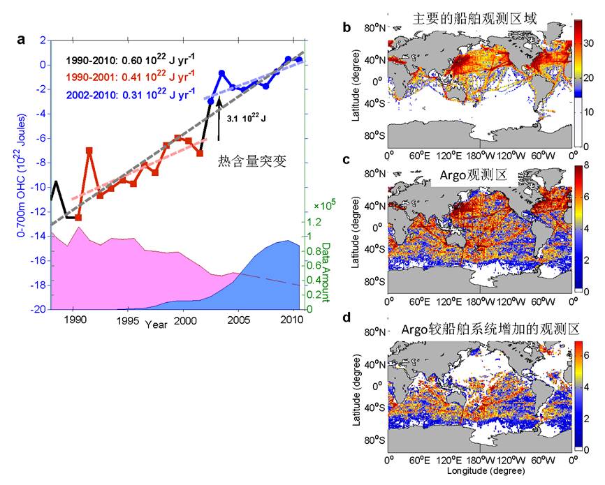 中国科学院大气物理研究所成里京和朱江发现:由于上述海洋观测系统的转变,全球上层(0-700m)海洋热含量在2001-2003年存在一个“突变”(图1a)。这个“突变”使得1990-2012全球海洋热含量变化趋势被高估40%。研究指出:船舶观测系统(1966-2001年)主要采样了变暖速率较快的海区,而中东太平洋,南大西洋等变暖速率较慢的区域缺乏足够的观测;而这两个区域均能被Argo系统覆盖。这种不均匀的采样是造成2001-2003年热含量估计突变的主要原因。