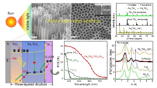 针对金属氧化物在可见光区水分解性能低的科学问题,研究人员提出一种通过形成“矢量迁移通道”的能级结构来引导光生载流子迁移的途径。实验上,通过将一层2~3 nm厚的Fe2TiO5窄禁带(2.2 eV)半导体材料包覆在高度有序的TiO2纳米管阵列表面,在Fe2TiO5/TiO2之间形成载流子分离界面,成功地将光生空穴从材料内部定向迁移到表面催化反应活性位点;同时,Fe2TiO5与TiO2匹配的导带结构极大减小了水分解反应的过电势,从而使得Fe2TiO5-TiO2复合结构在400-600nm波长范围的量子转换效率高达40%以上,总的能量转换效率达到2.7%。研究人员还利用同步辐射X射线吸收谱学和电化学阻抗谱技术等一系列测量和理论分析,证实了Fe2TiO5-TiO2界面的“矢量迁移通道”能级结构是实现光生载流子定向迁移的原因。