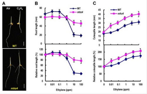 中国科学院遗传与发育生物学研究所植物基因组学国家重点实验室张劲松课题组和陈受宜课题组根据水稻黄化苗乙烯反应建立了一个快速高效的突变体筛选体系,并利用该体系分离鉴定了一系列水稻乙烯反应突变体mhz。其中mhz4呈现根顿感而胚芽鞘过敏感的乙烯反应表型(如图)。图位克隆发现MHZ4 编码OsABA4蛋白,可能参与调控脱落酸(ABA)合成途径中紫黄质向新黄质的转化。MHZ4 突变造成ABA缺失因而导致其乙烯反应异常;MHZ4 过表达水稻幼苗呈现与突变体完全相反的乙烯反应表型。遗传学、植物生理和分子生物学研究证明,在水稻根中,MHZ4 介导的ABA途径作用于乙烯信号通路下游,乙烯信号上调MHZ4 表达并特异地促进根中ABA的积累从而抑制根的伸长生长。该发现与拟南芥中报道的乙烯抑制根伸长不需要ABA的作用完全不同。在胚芽鞘中,MHZ4 介导的ABA途径作用于乙烯信号通路上游,至少通过抑制OsEIN2 的转录来负调控胚芽鞘乙烯反应。此外,mhz4 突变也影响了水稻的多个农艺性状,包括高位分蘖和节上不定根的发生等。这项研究首次揭示了水稻中乙烯通过ABA途径来调控根系生长,为探究乙烯信号对水稻等作物重要生长发育过程的调控机制提供了新线索。