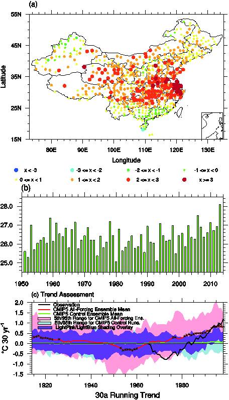围绕着2013年盛夏中国中东部热浪的归因研究,中国科学院大气物理研究所学者周天军、马双梅和邹立维等从长期气候变化趋势的角度,综合观测记录和国际耦合模式比较计划(CMIP5)的多模式的集合模拟试验数据,对2013年盛夏中国中东部地区的高温事件进行了归因分析。在“可以使用耦合模式的内部变率来表示实际的内部变率”这一假设下,分析表明,在20世纪90年代初期之后,可检测到人为增暖对中国中东部地区的影响(图1c);估算结果显示,人为强迫对2013年盛夏中国中东部的高温强度的贡献约为47.23%,对应的归因危险度约为58.42%;与此同时,自然的内部变率对该事件的发生也有重要贡献。