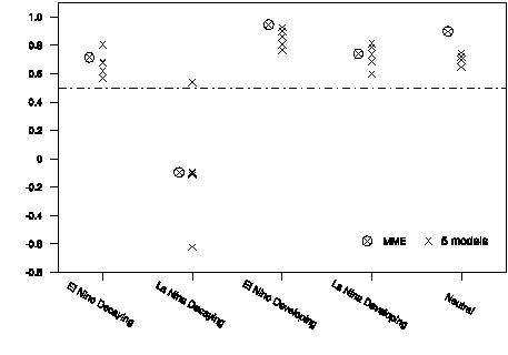 图示:模式对西北太平洋夏季副热带高压指数的预测技巧在不同ENSO位相下的分布图(MME为多模式集合)