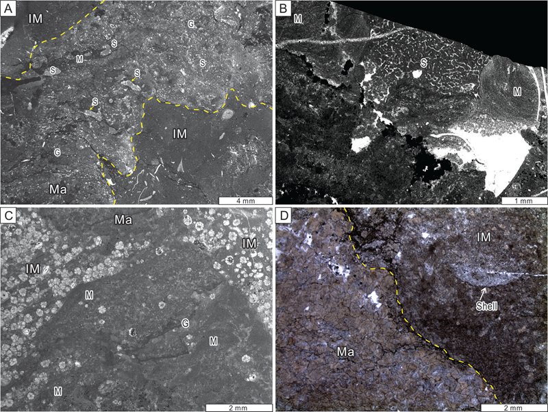 该项研究发现,华北台地东部地区寒武系第三统微生物礁主要由微生物Epiphyton形成的凝块石为主,而芙蓉统则以“迷宫状”(maceriate)微生物岩为特征。该微生物岩在全球同时期地层中广泛发育,且在其中几乎没有发现任何Epiphyton,而相反,作者近期的研究发现大量保存很好的海绵骨针,证实海绵类后生动物已经在芙蓉统广泛参与造礁,从而也将芙蓉统的微生物岩称之为后生动物-微生物礁。作者结合华北研究实例,并综述中外研究,发现这次生物礁的交替事件可能是由寒武系第三统末期的灭绝事件导致的,而非由区域沉积过程(如张夏组之上的淹没不整合面)引起。另一方面,在寒武纪晚期广泛发育的海绵-微生物礁证明了后生造礁动物在奥陶纪生物大辐射事件(GOBE)之前已经繁盛,如此,这是否会对奥陶纪生物大辐射事件在生物礁生态系统的响应时限有一定意义呢?对世界其它地区的同时期微生物岩系统、详细的微相研究将有可能对这些科学问题提供线索。