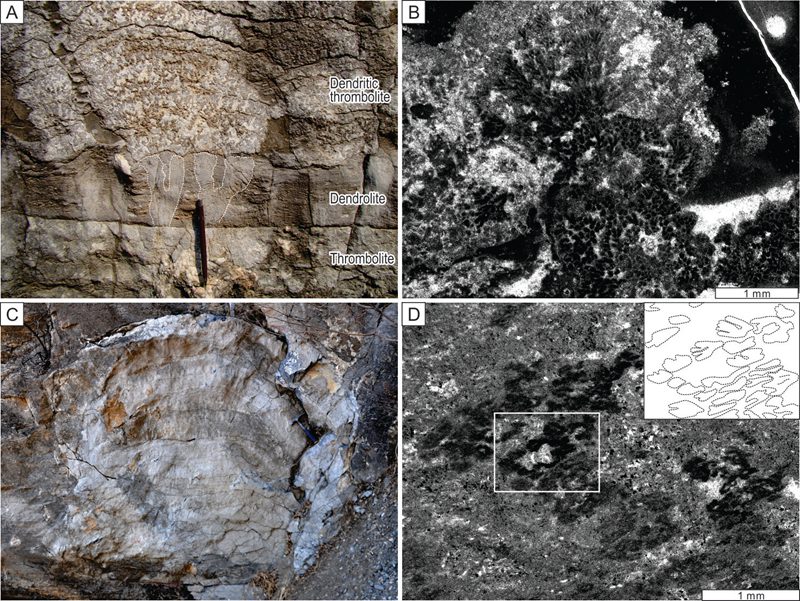 图3. 华北台地广泛发育的寒武系第三统凝块石微生物礁,含有大量的Epiphyton