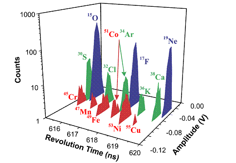 在IMS中,离子在储存环中的回旋频率和其质量电荷比直接相关,由此实现离子鉴别和质量测量。而本次实验中,51Co27+和 34Ar18+的质量电荷比非常接近,差别为5×10−6,仅靠回旋周期无法区分它们。科研人员在实验中发现,离子在飞行时间探测器上产生的信号幅度和离子所带电荷有直接关系。基于这个发现,科研人员发展了一种新的离子鉴别方法,在IMS中首次实现了储存离子的电荷分辨,从而测量了短寿命核素51Co的质量。通过其质量过剩值ME(51Co)=−27,342(48)keV,可以得到其单质子分离能Sp(51Co)=+142(77)keV。新发展的电荷分辨的IMS方法,对测量质荷比接近的原子核的质量,特别是在核结构研究中对具有重大意义的质子中子数相等的原子核研究将起到重要作用。
