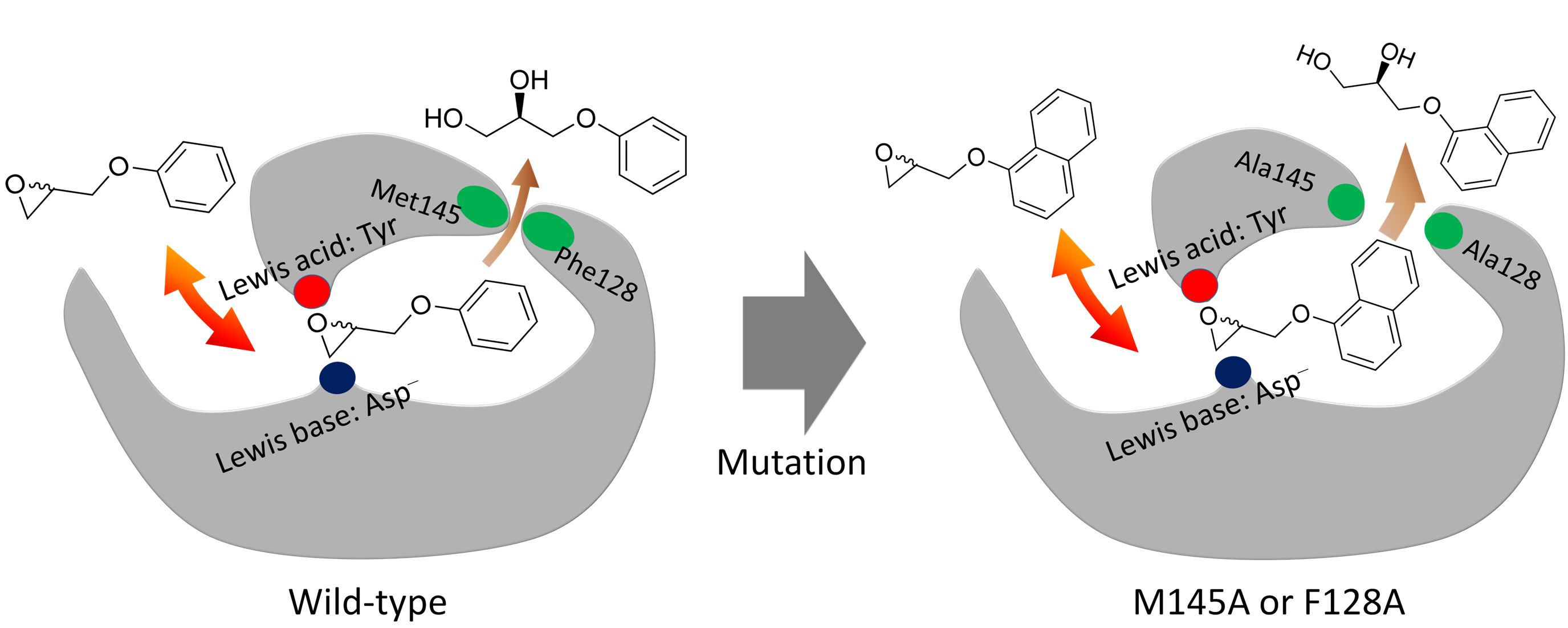 环氧水解酶催化环氧化物的立体选择性水解,得到光学纯产物可用于手性药物的制备。天然来源的环氧水解酶不具备在药物合成中的广谱性,特别是对一些大位阻底物只有很低的催化活性和立体选择性。传统的蛋白质工程改造研究基本都集中在底物进入通道以及酶催化活性中心区域上。在该研究中,研究人员首先解析了来源于巨大芽孢杆菌的环氧水解酶BmEH的母体及其与底物类似物复合物的高分辨率晶体结构,然后从结构信息和酶动力学数据出发推测该环氧水解酶存在独立的产物释放通道,与现已报道的环氧水解酶结构有显著差别。该观点得到了蛋白质质谱、突变体三维结构、分子动力学模拟等实验结果的证实,揭示了酶的活性中心与产物释放通道之间的区域是影响催化活性的瓶颈位置。针对新发现关键位点的定点突变可大幅提高酶对大位阻底物的催化活性和立体选择性,其中对心血管药物分子普洛奈尔手性前体的拆分效率提高达100倍。在此基础上对这些位点进行饱和突变可以量身定制出不对称合成其他心血管药物β-阻断剂药物前体的环氧水解酶突变体库(Angew. Chem. Int. Ed., 2014, 53, 6641–6644),有关工作被SynFact 2014, 10(8), 0886作为亮点报道。