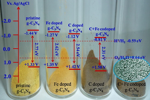 在上述研究工作的基础上,该研究团队与合肥工业大学徐进章教授及其博士研究生张守伟合作,利用简单的热转换方法在制备金属、非金属共掺杂石墨相氮化碳材料方面取得新进展。相关研究成果“Bandgap Engineering and Mechanism Study of Nonmetal and Metal Ion Codoped Carbon Nitride: C plus Fe as an Example”发表在国际化学学术期刊《欧洲化学》上(Chemistry-A European Journal, 2014,20,9805-9812)。