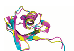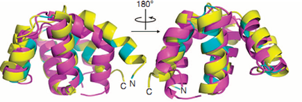从头设计蛋白质的实际空间结构(黄色)与目标结构(红色)比较