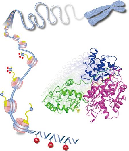 众所周知,DNA(脱氧核糖核酸)构成基因组,是生命遗传信息的基本载体。人体的DNA存在一种至关重要的化学修饰,即甲基化修饰,它起到一个开关的作用,决定特定基因的表达或失活。基因组上DNA甲基化在胚胎发育过程中发挥重要作用,甲基化模式的紊乱与许多癌症及发育失调综合征有密切关系。这个修饰是由DNA甲基转移酶DNMT3A及其家族成员完成的。在急性骨髓性白血病(Acute Myeloid Leukemia, AML)患者中,编码DNMT3A的基因经常携带突变,并且携带突变的患者往往预后更差。DNMT3A如何在基因组上精确建立DNA甲基化,一直是这个领域研究的难点。