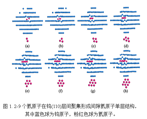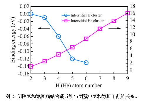 体心立方钨具有高熔点,良好的抗中子辐照和抗溅射腐蚀等优点,被选为国际热核聚变实验堆(ITER)的面向等离子材料。来自芯部等离子体(D-T聚变反应)中的氢同位素和氦离子在材料中的行为往往导致面向等离子体材料的失效。科研人员使用密度泛函理论方法研究了金属钨中氢和氦气泡的成核和生长机制,发现氢原子很难在钨的间隙位置聚集,而氦原子倾向于在钨(110)层间聚集形成密堆积的单层结构(见图1)。结合能计算进一步证明了单层结构形成的可能性(见图2)。氦单层可能为实验上观察到的扁平状氦气泡的初始构型。由于局域应力的存在,当氦原子数超过5时,氦单层的近邻可能发射自间隙原子而形成弗兰克尔缺陷对。