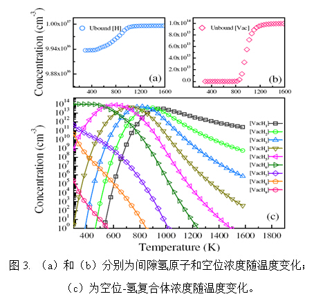 此外,基于质量反应定律(the law of mass action),科研人员计算了空位-氢复合体浓度随温度的变化关系(见图3),该结果表明在ITER的服役温度(1000K)附近,空位-氢的复合体大量存在,相比之下空位-氦则更加稳定。研究还表明,氢和氦在空位中的聚集促进了空位与空位之间的结合。因此,氢和氦气泡可以通过以下两种方式成核和生长:(1)空位捕获氦原子,当氦原子浓度达到阈值时,空位周围发射一个自间隙原子,长大的空位再捕获氦原子再发射自间隙原子直到氦气泡的形成。(2)氢和氦原子在空位中的占据,促进了空位的聚集从而形成空位团簇,而氢和氦在该空位团簇中聚集导致氢和氦气泡的形成。该研究成果为理解面向等离子材料中氢氦行为和氢氦气泡形成机制等方面提供了新思路。相关研究结果发表在Nuclear Fusion 54, 103007(2014)。