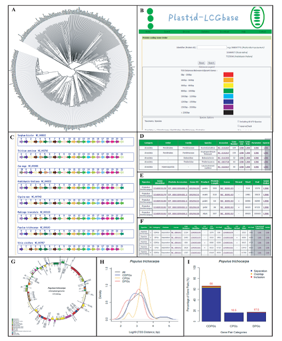 该数据库共收集470个质体(主要是叶绿体)基因组,将物种按照界、门、纲、目、科、属进行分类整理。显示基因组水平的宏观基因分布情况以及不同基因组间DNA和编码序列的同源程度。展示不同进化尺度和分类下成对基因的保守模式以及周围基因的插入或删除、重排和易位等基因变异模式。此外,按照转录方向参数和物理距离参数的原则,将成对基因分成了三种类别“头对头”、“头对尾”和“尾对尾”以及三种模式“分离”、“重叠”和“包含”,同时考察成对基因转录起始位点间距离的可变性。数据库还通过连接高度保守的基因对,为每个物种鉴定了潜在的操纵子结构。