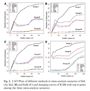 最近,中国科学院合肥物质科学研究院智能机械研究所机器智能与计算生物学实验室王红强课题组开发出一种高通量数据meta分析方法。该方法巧妙地将联合矩阵分解技术与基因调控模型相结合,有效揭示了生命分子活动在不同遗传分子水平上的系统一致性,为深入探索生命活动规律提供了新的手段和途径。大量的模拟实验证实,该技术对肿瘤标记物的识别性能远远优于现有方法。研究结果也证实影响高通量meta分析的主要因素为数据依赖性和异质性。这两种因素将现有分析方法分为了三组,其性能从高到低具有显著的区别(如图)。结合非小细胞肺癌(NSCLC)的多组学数据,所提出的方法识别出了多种已知的甲基化驱动致癌基因,也发现了许多新的NSCLC标记物。这些新的标记物可用于开发新的NSCLC甲基化药物。