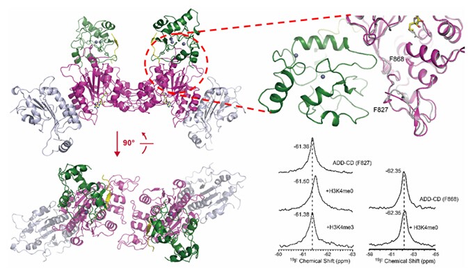 核磁共振方法在分析蛋白质构象变化和动态特性方面具有其他结构生物学方法难以比拟的优势。田长麟课题组长期以来发展能突破蛋白质分子量限制的核磁共振方法,包括基于非天然氨基酸方法的19F定点标记方法有效实现超大分子量蛋白质复合物的构象变化分析。石攀博士应用该方法详细分析了DNMT3A蛋白多个不同位点在甲基化或非甲基化组蛋白H3片段存在情况下的核磁共振光谱,确认了DNMT3A蛋白只受非甲基化H3蛋白的功能调控。