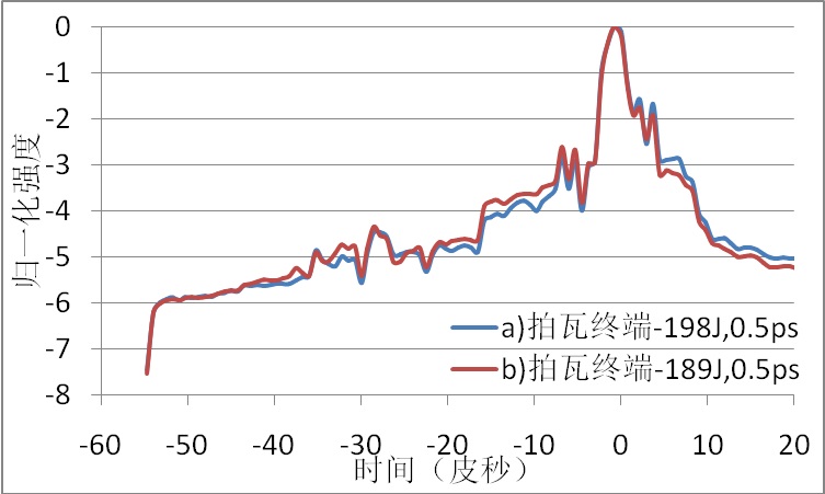 10月6日和7日,皮秒参数测量子系统获得了拍瓦激光系统输出的两发次大能量数据。压缩前的能量分别为198J、189J,脉冲宽度为0.5ps。实验结果表明,在-30ps位置的噪声小于10-5,在-53ps位置的噪声小于10-6。