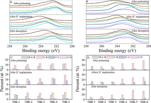 图1. 在70 % B (A, C)和50 % B (B, D)硼膜中碳的化学态。XPS谱图按照碳含量排列,碳含量从上而下依次升高。