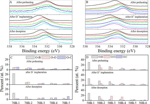 图2. 在70 % B (A, C)和50 % B (B, D)硼膜中氧的化学态。