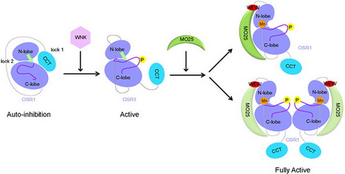 OSR1激酶双重自抑制及WNK/MO25介导其激活的模式图