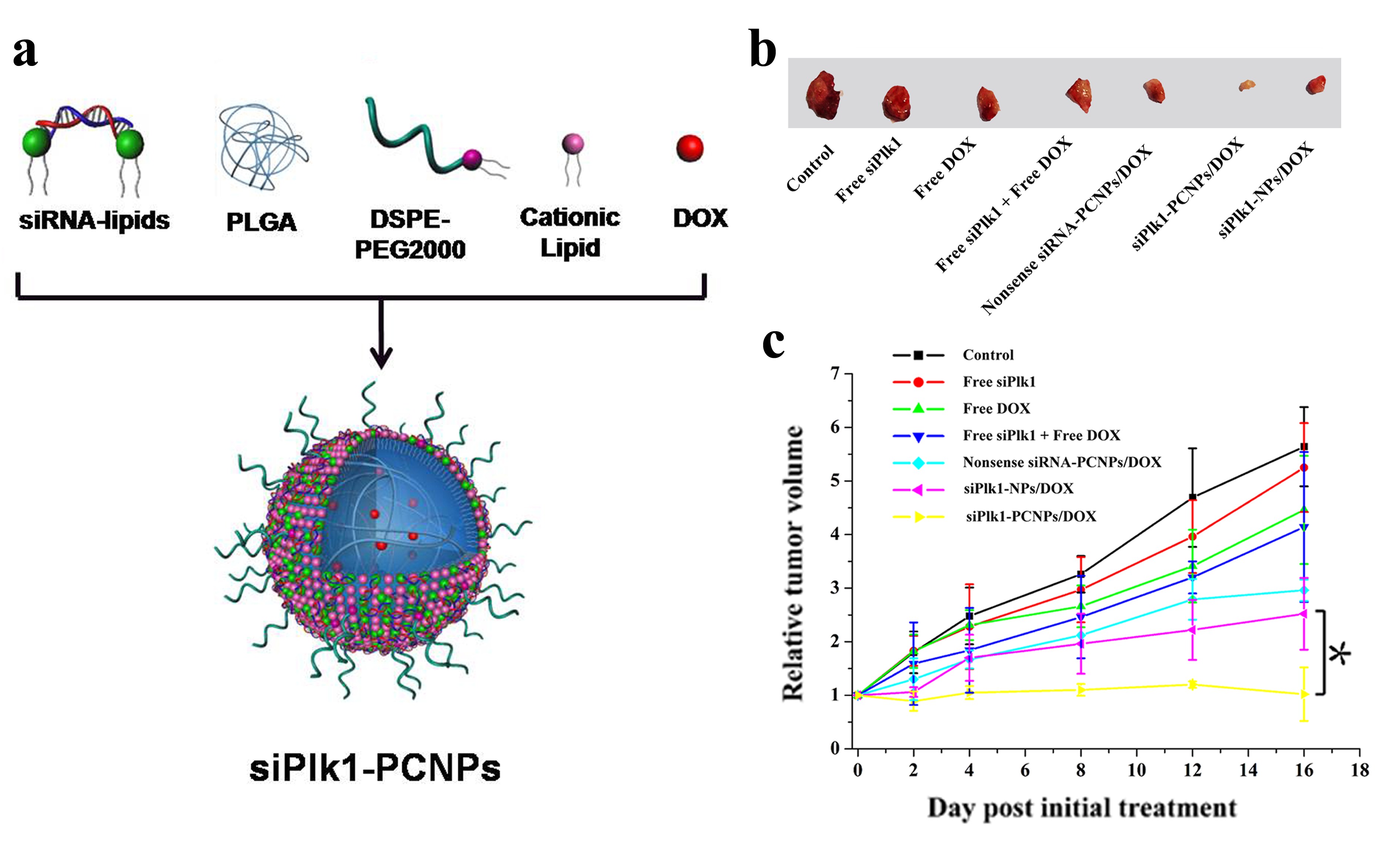 a. siPlk1-PCNPs/DOX纳米给药系统示意图 b.肿瘤图 c.肿瘤体积变化图