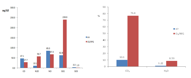 通过热态调试和相关试验,研究人员初步掌握了循环流化床由空气燃烧向高浓度氧气再循环富氧燃烧的切换操作方法,对煤和半焦的燃烧温度分布、外置换热器工作特性、污染物排放特性以及炉内石灰石脱硫特性等进行了研究。通过对空气和O2/RFG两种燃烧方式的对比试验,获得了一定的试验数据,可用于研究两种燃烧方式的区别。与传统空气燃烧相比,高氧气浓度烟气再循环燃烧尾部CO2浓度得到了大幅度提升,燃烧效率有所提高,NOX排放减小,但由于再循环使得H2O蒸汽和SO2在烟气中富集。