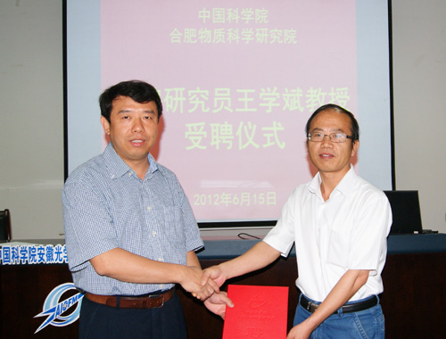 6月15日,中科院合肥物质科学研究院院长王英俭在中科院安徽光机所为美国西北太平洋国家实验室王学斌教授颁发了聘书,正式聘请他为合肥研究院特聘研究员。