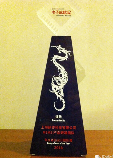 由环球资源Global Sources旗下领先行业媒体《电子工程专辑》、《国际电子商情》及《电子技术设计》共同颁发的“2014中国年度电子成就奖”(The China Annual Creativity in Electronics Awards 2014)揭晓。颁奖典礼于9月2日在“第十九届IIC-China”(IIC-China研讨会暨展览会)期间举办。中国科学院上海微系统与信息技术研究所参股的上海矽睿科技有限公司产品研发团队荣获年度最佳设计团队奖。