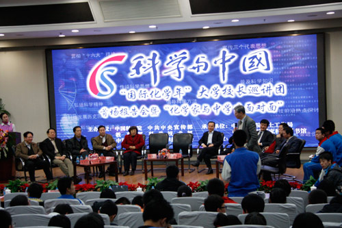 时间:2011年3月26日14:00-17:00 地点:中国科学院国家科学图书馆一层报告厅 议程: 14:00-14:20 中科院院长白春礼为“国际化学年——化学让生活更美好”专题展览开展致辞并揭幕 14:20-15:30 “科学与中国——国际化学年大学校长巡讲团” 首场报告会 报告人:北京大学校长周其凤、中国科技大学校长侯建国 主持人:中科院副院长李静海 15:30-17:00 “化学家与中学生面对面”互动交流活动 化学家代表(13位院士): 白春礼、陈凯先、程津培、高 松、何鸣元、侯建国、李灿、 李静海、杨玉良、张玉奎、赵玉芬、郑兰荪、周其凤 学生代表:北京市各中学学生代表300人 主持人:复旦大学校长杨玉良 |