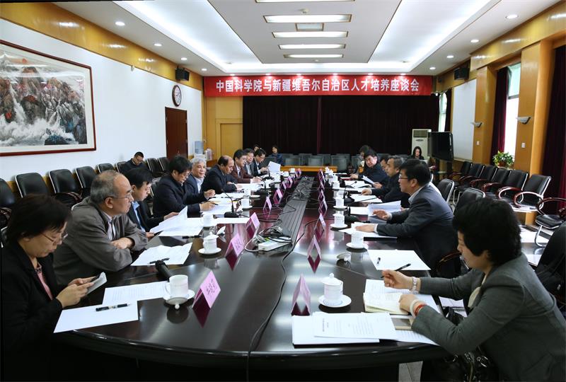 4月7日上午,中国科学院与新疆维吾尔自治区人才培养座谈会在中国科学院大学玉泉路校区召开。中科院副院长、国科大校长丁仲礼与新疆党委常委、副主席艾尔肯?吐尼亚孜就中科院与新疆维吾尔自治区人才培养工作相关合作事宜交换了意见。国家教育部民族司,中科院前沿科学与教育局、科技促进发展局、新疆分院及国科大相关院系负责人出席会议。
