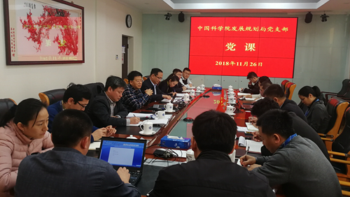 11月26日,中国科学院副秘书长汪克强在中科院发展规划局党支部党员大会上讲党课。会议由发展规划局党支部书记谢鹏云主持,支部全体党员同志和发展规划局职工参加。