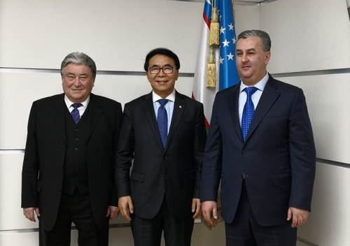 白春礼与乌兹别克斯坦副总理Holmuradov C. R(右)、乌兹别克斯坦科学院院长Bekhzod Yuldashev合影